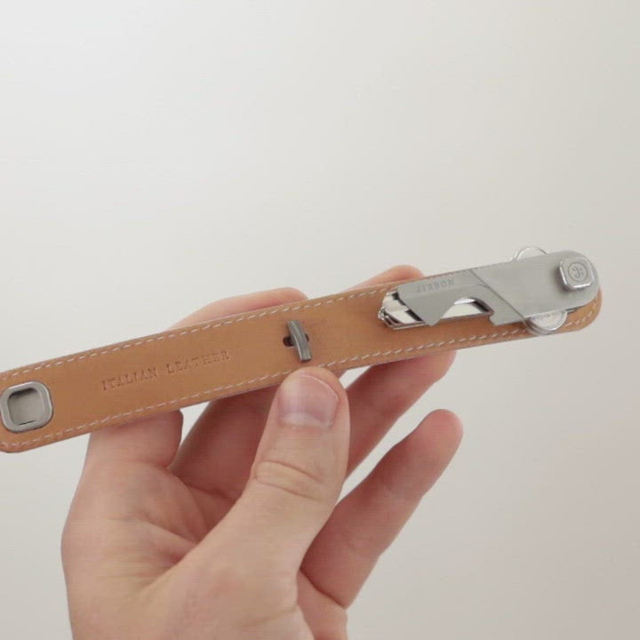 Top-grain Italian leather & stainless steel clip-lock.