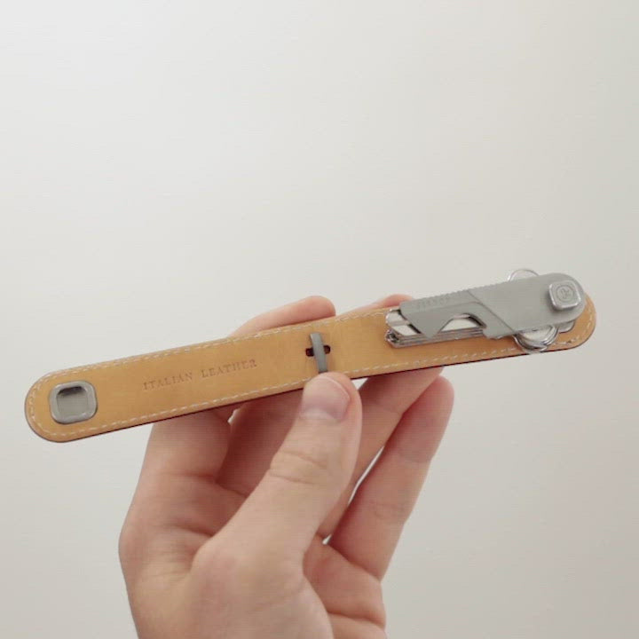 Top-grain Italian leather & stainless steel clip-lock.